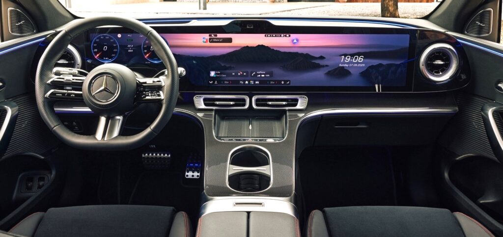 Cuesta creer que ese «cine» pueda resultar práctico, sobre todo en cuanto a la seguridad y el necesario desvío de la atención del conductor, pero… No sé, no me parece práctico; menos aún ergonómico. Tampoco me parece acertada la elección de enormes salidas de aire circulares, que poco sintonizan con el resto del interior. Volante deportivo y un interior eclipsado y opacado por el protagonista central, la pantalla. Con una arquitectura eléctrica de 800 CV, el GLC EV tendrá una autonomía de algo más de 700 km gracias a su batería de 94 kWh. ¿Cómo serán sus ventas contra su hermano GLC térmico? El mercado dirá…