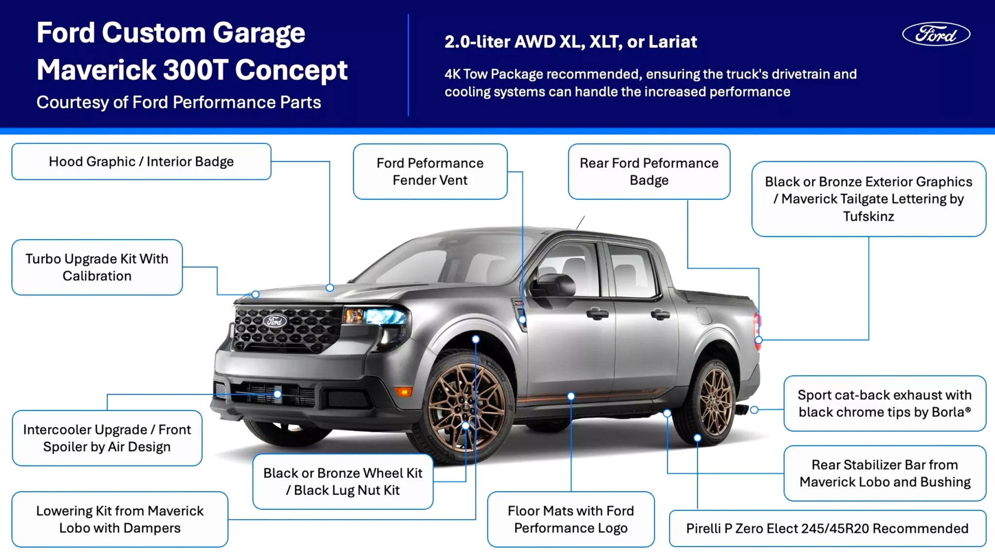 La actual Maverick más potente en el mercado norteamericano, naftera, llega a 250 HP. En colaboración con Ford Performance, Ford Custom Garage presenta en el Sema Show, que finaliza mañana, un concept basado en Maverick (un kit en realidad), denominado 300T que aplica varias modificaciones mecánicas a las distintas versiones. Por lo pronto, cambia el motor 2.0 por el Ecoboost 2.3 del Mustang, con una potencia de 300 caballos. No solo eso, la suspensión ha sido modificada, el despeje al suelo (-10 mm adelante, -30 mm atrás), la barra estabilizadora, el escape y algunos otros elementos.