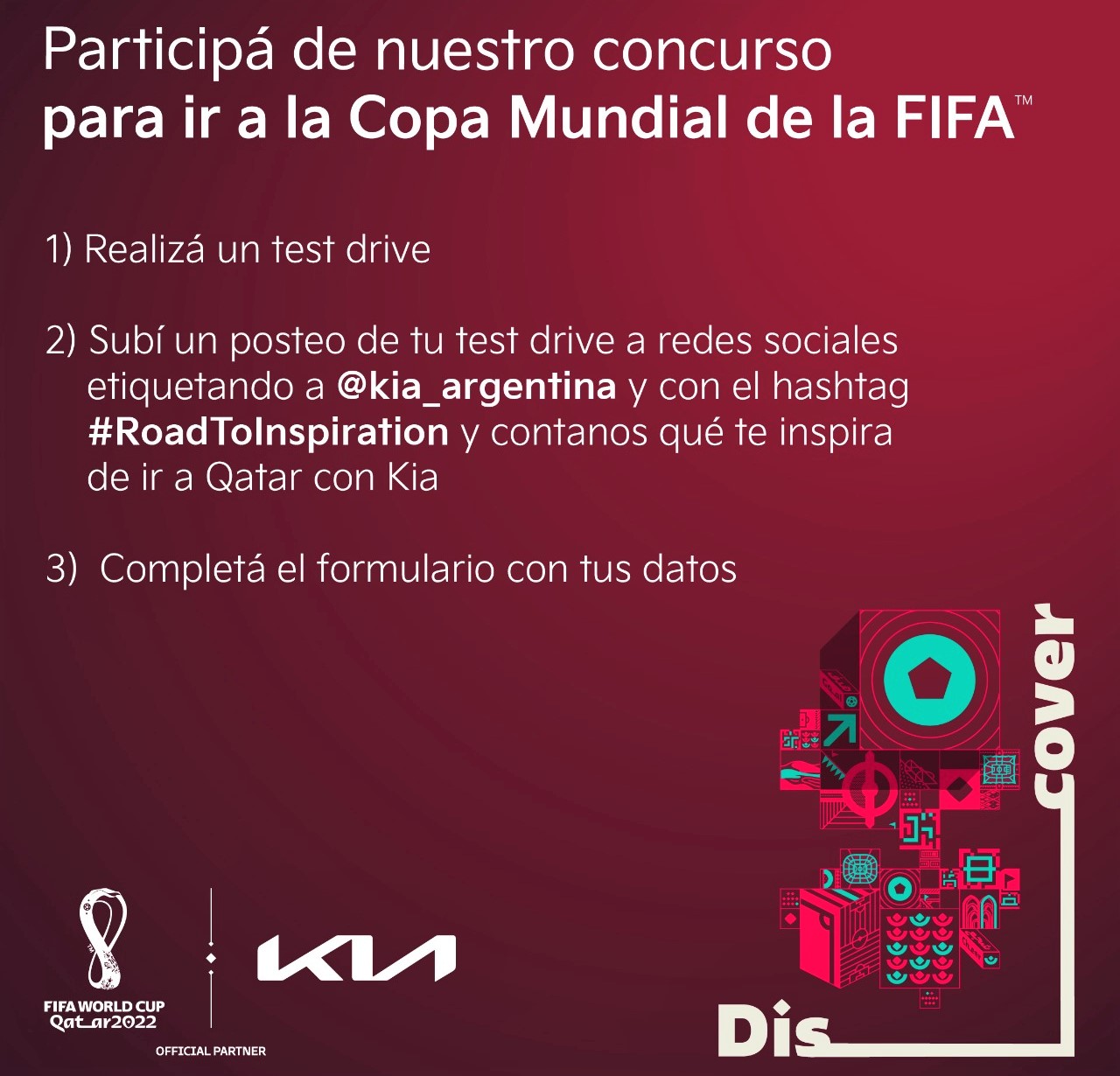 Ingresar a www.kia.com.ar/mundialqatar2022, completar el registro con tus datos personales y sacar un turno para proceder al test drive en el concesionario seleccionado participante. Una vez finalizado el test drive, el participante debe publicar en su perfil de Instagram una foto dentro del Kia, etiquetando a @kia_argentina junto al hashtag #RoadToInspiration y contar qué lo inspira de viajar con Kia al campeonato mundial de fútbol. Por último, debe completar con sus datos el formulario que se entregará al finalizar la experiencia de manejo.